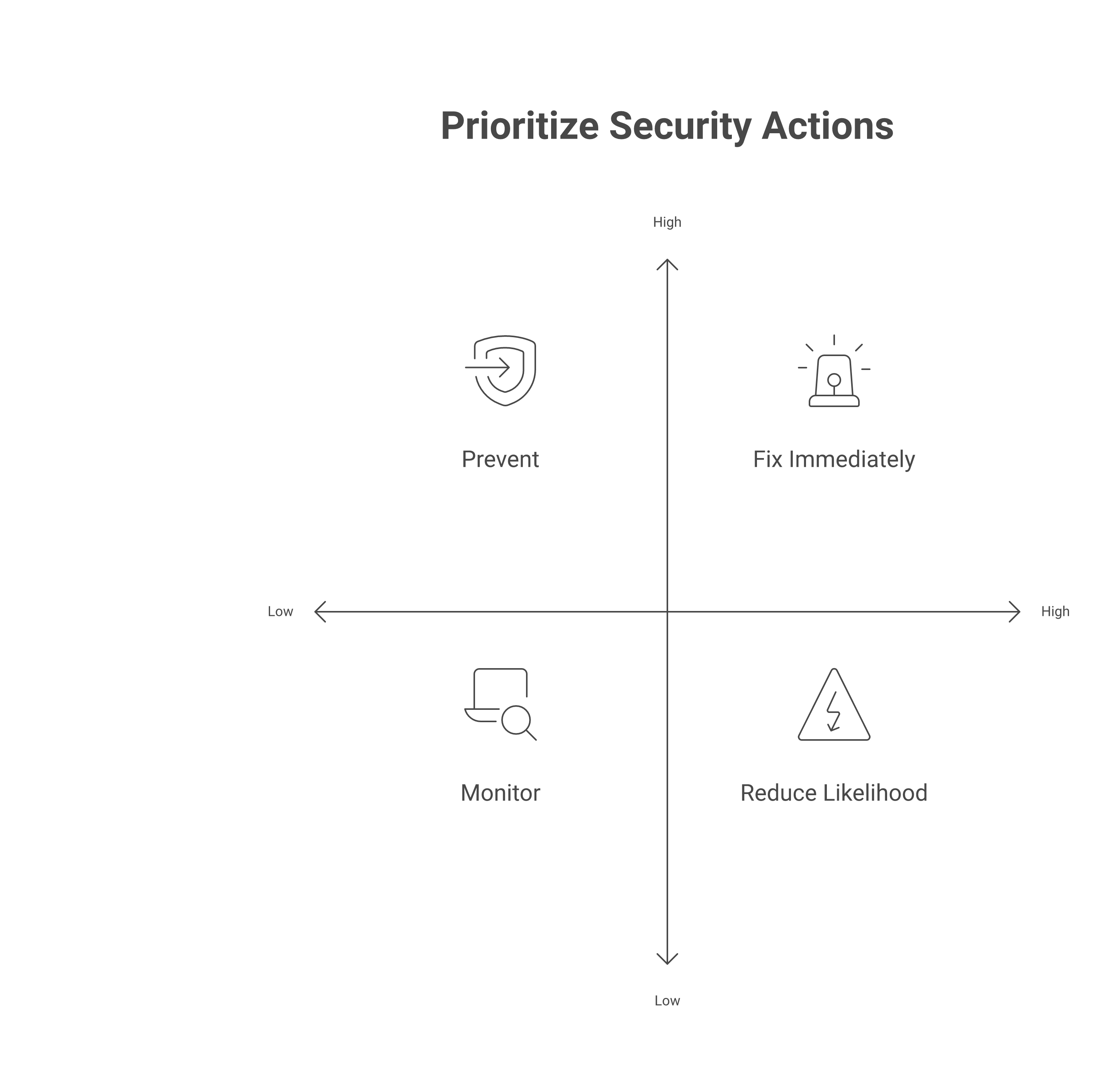Risk breakdown (one slide). A 2x2 matrix. Axis 1: likelihood of breach (low to high, based on threat surface + controls). Axis 2: business impact if breached (cost, customer impact, regulatory). Plot each high-risk system as a point. This is the frame the board already thinks in.